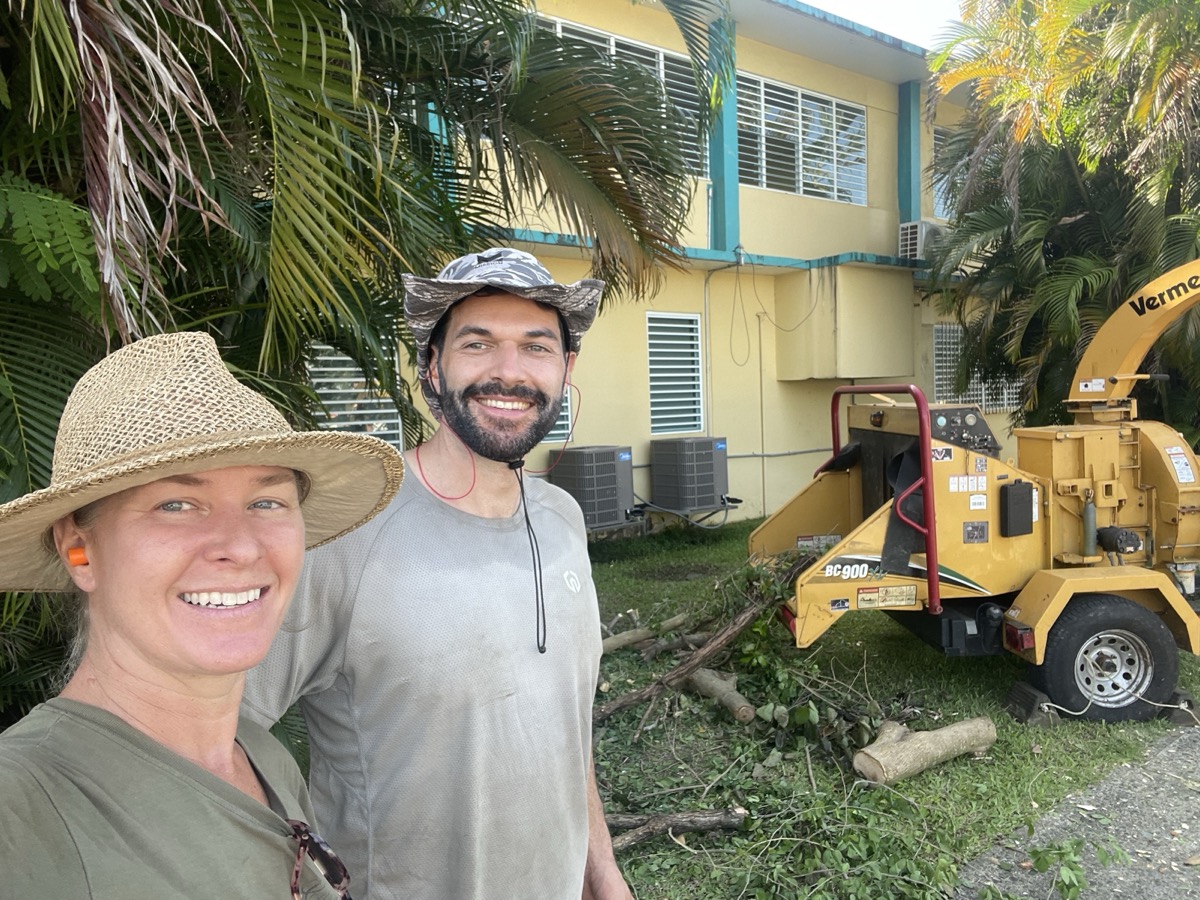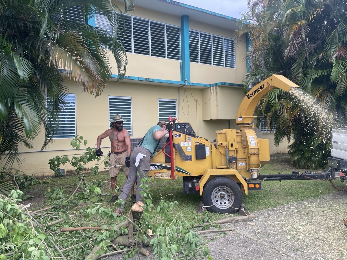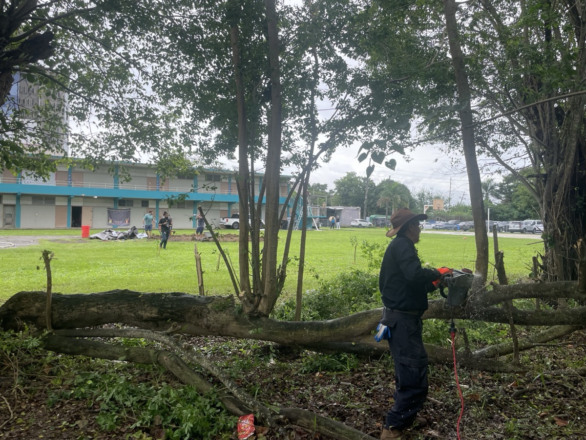 Volunteers dig the garden parameter, build the garden dome, use chainsaws and machetes to cut and clear trees blocking the sun in the courtyard, and cleared the area for the water cistern and designated compost area.