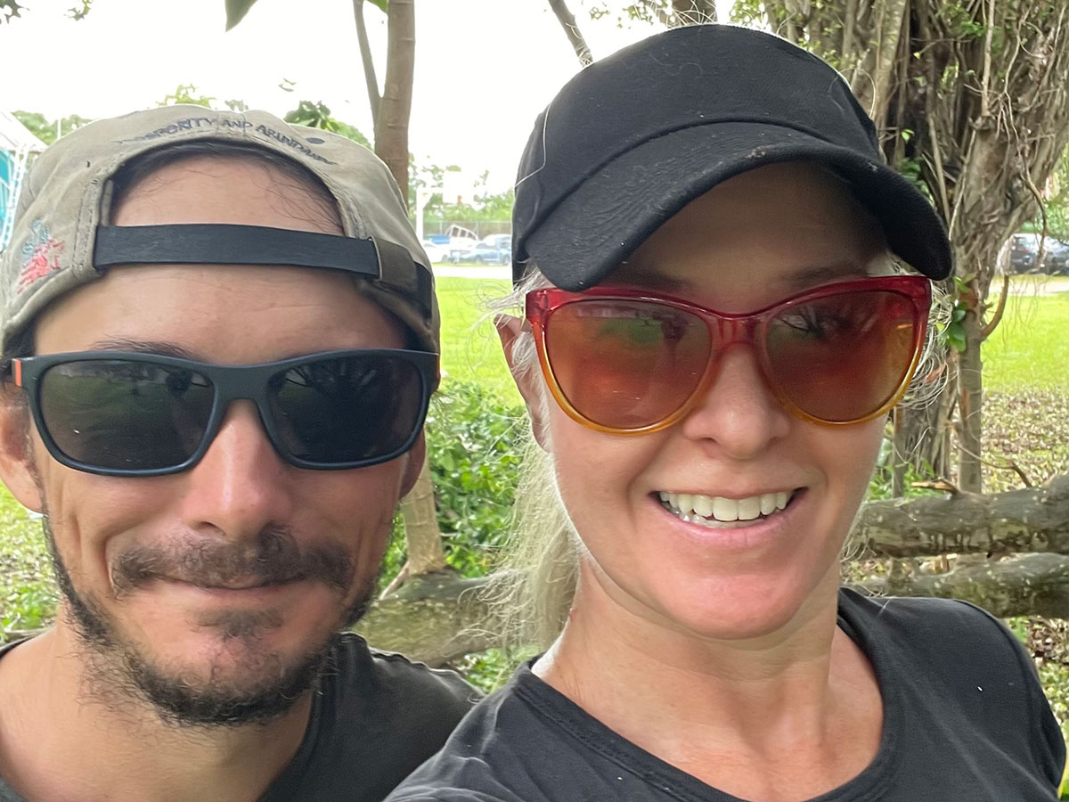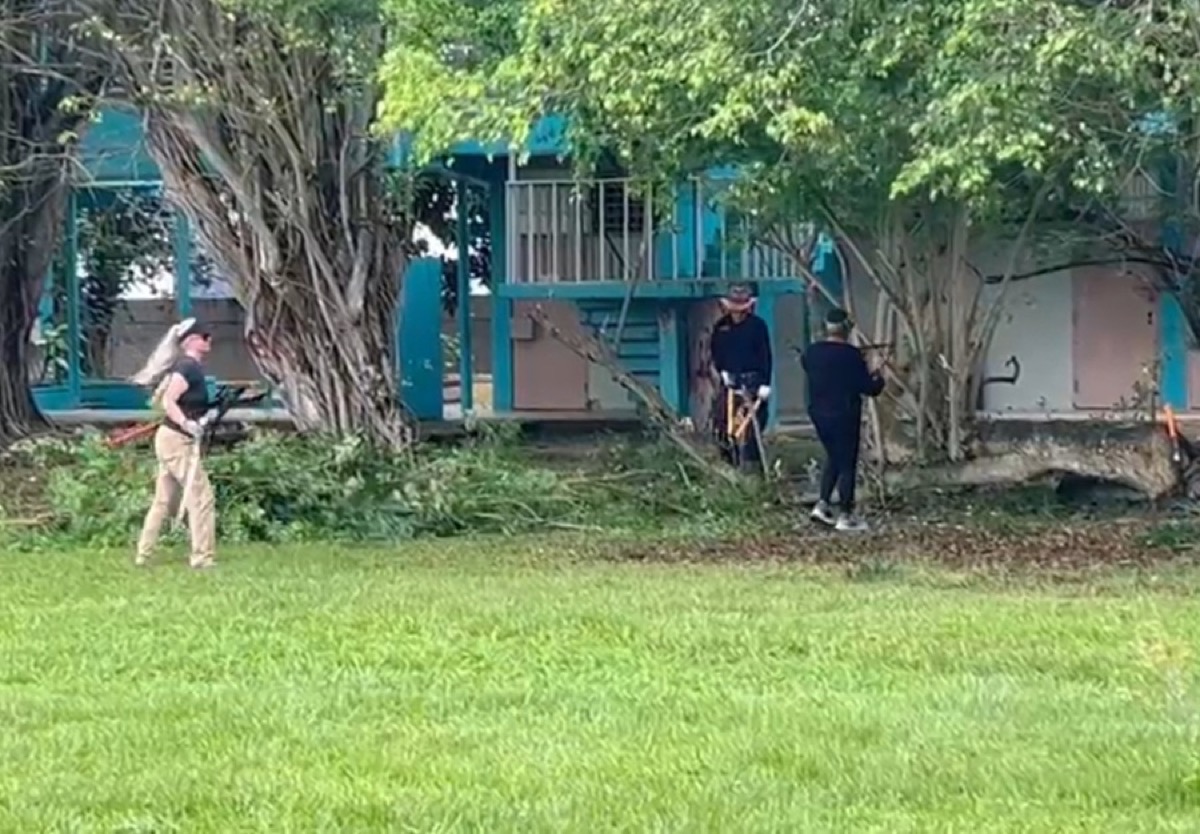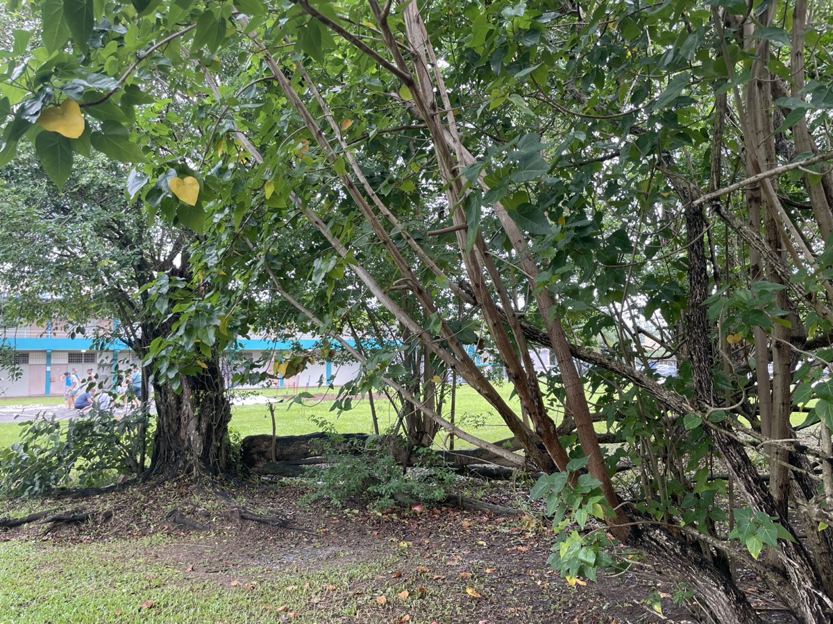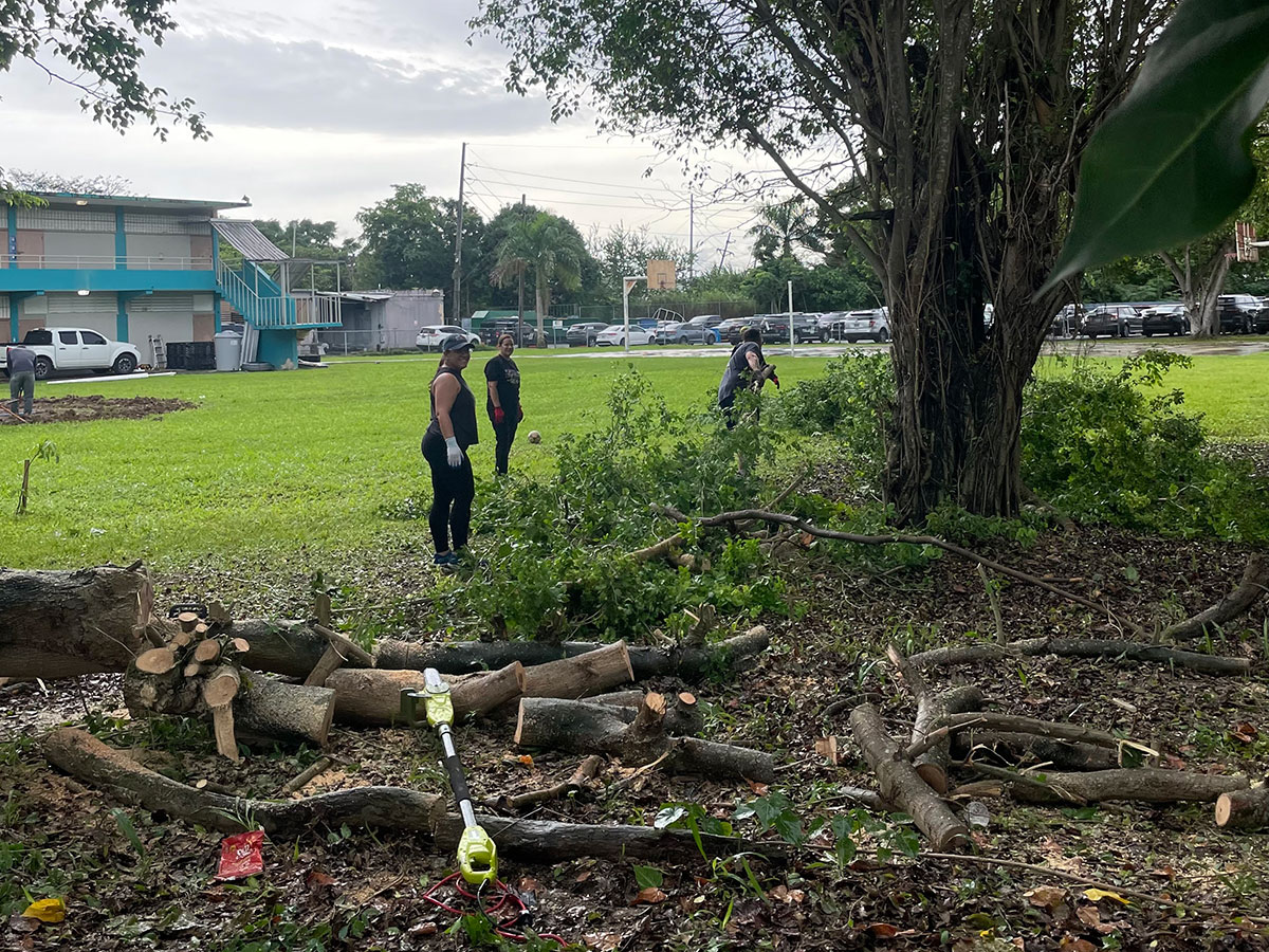 Volunteers dig the garden parameter, build the garden dome, use chainsaws and machetes to cut and clear trees blocking the sun in the courtyard, and cleared the area for the water cistern and designated compost area.